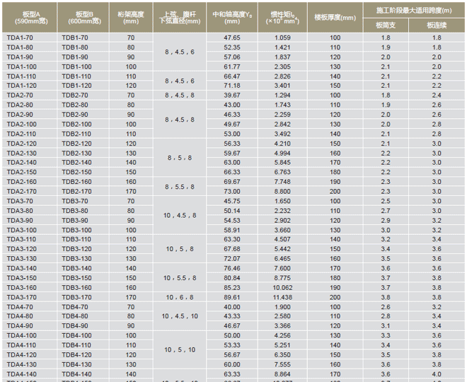 A型和B型是目前主推的.鋼筋桁架樓承板產(chǎn)品兩大類(lèi)型,A型產(chǎn)品寬度為590mm,B型產(chǎn)品寬度為600mm,兩大類(lèi)型產(chǎn)品的具體型號(hào)、尺寸和截面系數(shù)等參數(shù),請(qǐng)?jiān)斠?jiàn)下表。